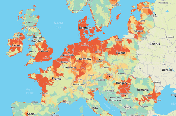 Displayed here is a heatmap of recorded structural barriers in rivers, which can negatively impact the migratory behavior of river fish species.